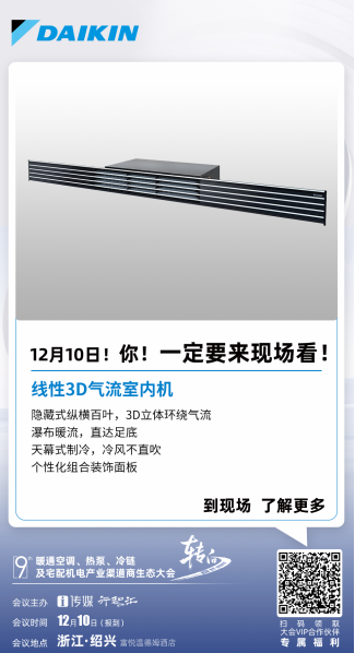 本次大会希望通过干货内容、展示平台和传播方式的升级,为行业搭建一个价值叠加、资源合作、协同进化的共赢平台,为专家、厂家、商家提供一个更具交流深度的沟通平台。在此背景下,作为空调领域的头部企业,大金空调即将亮相此次活动。多年间,大金空调始终坚持以卓越的技术和系统稳定性,推动行业向前发展。面对当下消费者对居家环境健康、舒适、智能化需求的不断升级,大金将与渠道商朋友一同探讨,如何更好地将“以人为本”的空气理念融入解决方案,为用户痛点、难点的解决提供前瞻性的技术支持。