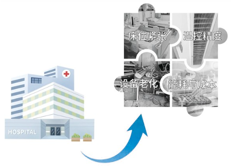 作为区域医疗核心,庆阳市人民医院承担着高标准的诊疗任务,但面临着床位紧张、设备老化、传统空调系统能耗高、温湿度控制精度不足、运维成本高等痛点,尤其在手术室、I C U 等区域, 难以满足高洁净、安全的医疗环境需求和恒温恒湿、24h稳定运行的严苛要求。