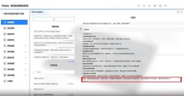 针对上述痛点,海尔将设备控制、数据分析、策略生成集成为具备自主决策能力的AI智能体。其搭载的Deepseek和通义国产大模型基底,融合百万级暖通专业知识库与实时运行数据,使系统能够像资深工程师一样“理解”建筑环境。