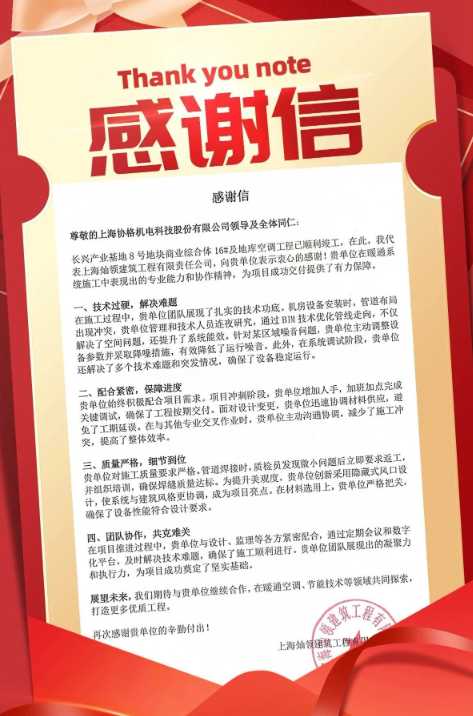 一封感谢信,浓浓合作情。此次长兴阳光天地商业综合体项目的顺利竣工,是协格机电与灿领建筑携手并肩、通力协作的成果。未来,协格机电将继续秉持“以技术铸就品质,以服务赢得信赖”的理念,深耕节能空调领域,践行绿色环保愿景,期待与更多合作伙伴携手,在暖通空调、节能技术等领域共同探索创新,打造更多高品质工程,为推动行业高质量发展贡献力量。