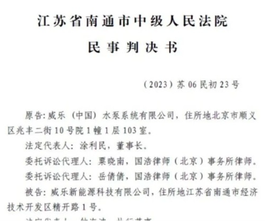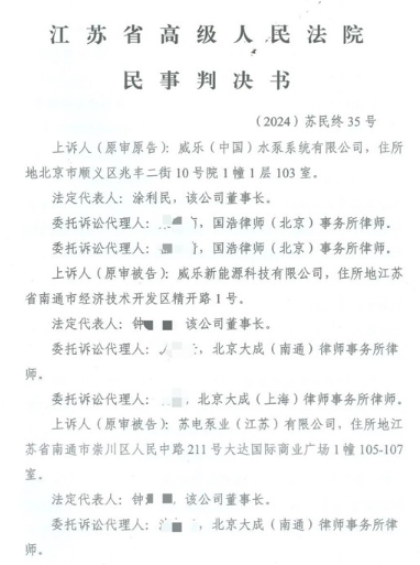 2026年1月,威乐中国收到江苏省高级人民法院下发的二审判决书。二审法院经审理认为,威乐新能源科技有限公司、苏电泵业(江苏)有限公司及钟某共同实施了商标侵权及不正当竞争行为,钟某作为相关公司的实际控制人,依法应承担共同侵权责任。根据《(2024)苏民终35号》判决明确: