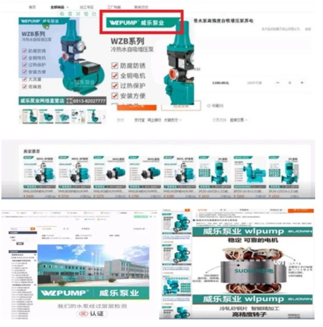 产品性能介绍页以及企业厂名实景照片上、出现有“WLPUMP®威乐泵业”、“威乐泵业”、“中国·威乐”等标识⬇