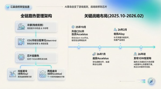 整体来看,江森自控正通过“投资前沿液冷技术+并购关键核心部件+强化系统集成能力”的三步战略,快速补齐芯片级液冷能力,构建从冷源到芯片的垂直一体化布局。在AI算力密度快速提升、功耗与散热需求爆发的背景下,这一系列动作不仅强化其在高端数据中心市场的竞争力,也表明传统暖通巨头正在全面向液冷与热管理赛道转型,行业竞争格局正由设备供应商向系统集成与技术生态能力升级。