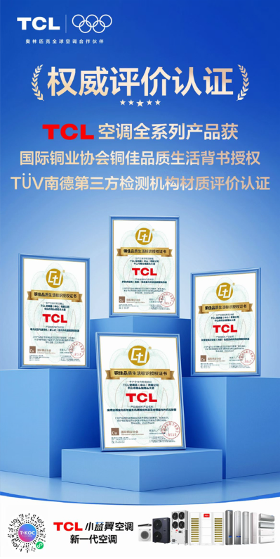 新年伊始,TCL空调传来捷报,旗下全系列产品获国际铜业协会铜佳品质生活背书授权,斩获TÜV南德第三方检测机构材质评价认证。