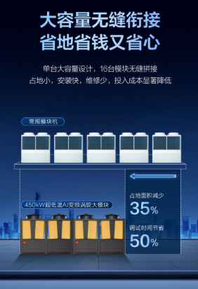 面对大型项目对设备容量、安装空间及运行稳定性的严苛要求,TCL 450kW大模块给出了创新性答案。其单台450kW的制热量(额定制热工况)实现了“一台抵三台”的整合效果,最多支持16台模块无缝拼接,极大地节省了安装占地面积,简化了系统设计,降低了初期安装与管道成本。