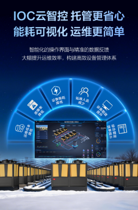 同时,机组搭载IOC云智控系统,实现了能耗的可视化管理。通过智能化的操作界面,运维人员可以实时掌握机组运行状态、能效数据与历史曲线,实现精准的数据反馈与高效的设备管理,大幅提升运维效率,降低人力成本。