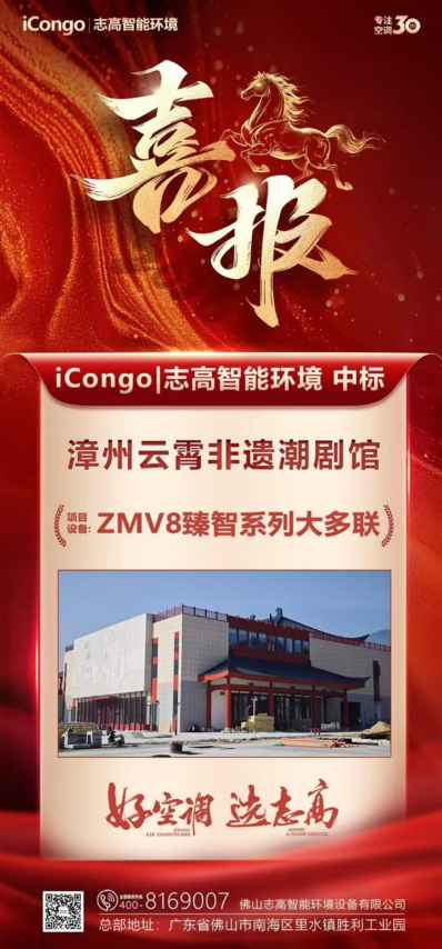 文旅项目承载着中华优秀传统文化的传承使命,其场馆建设不仅是文化交流与传播的阵地,更对温湿度控制、舒适度体验及绿色节能效果提出了综合性高要求。日前,iCongo|志高智能环境再传喜讯——成功中标福建漳州云霄非遗潮剧馆中央空调项目。该项目将采用旗下ZMV8臻智系列大多联机组,为这座以潮剧文化为核心的非遗场馆营造舒适、节能的空气环境,助力文旅精品工程建设。