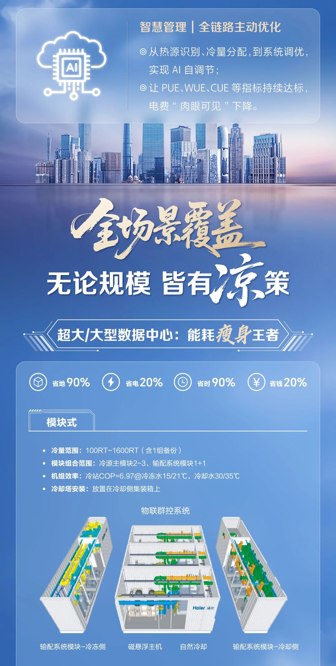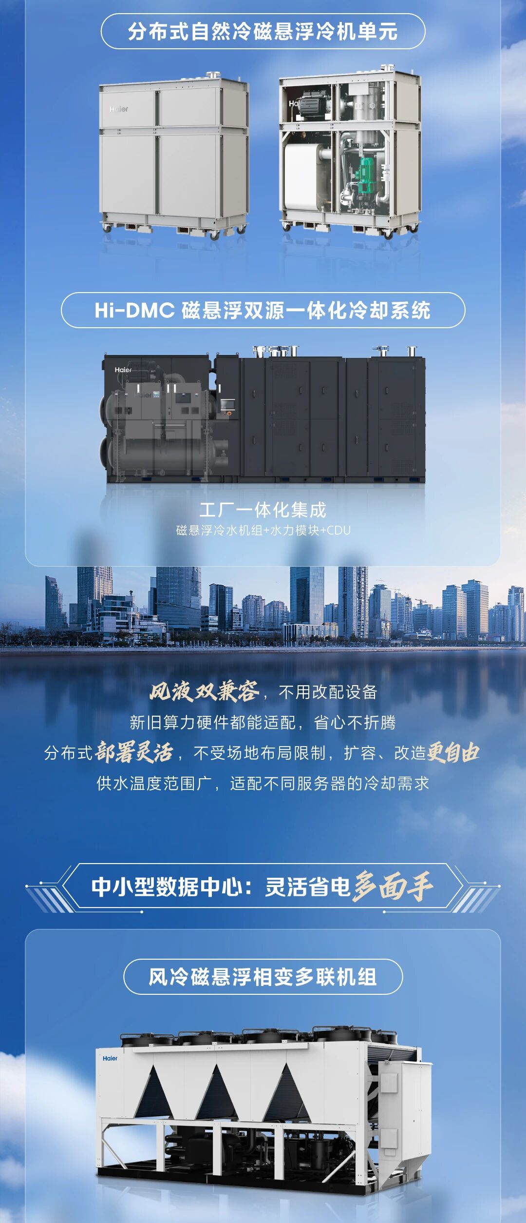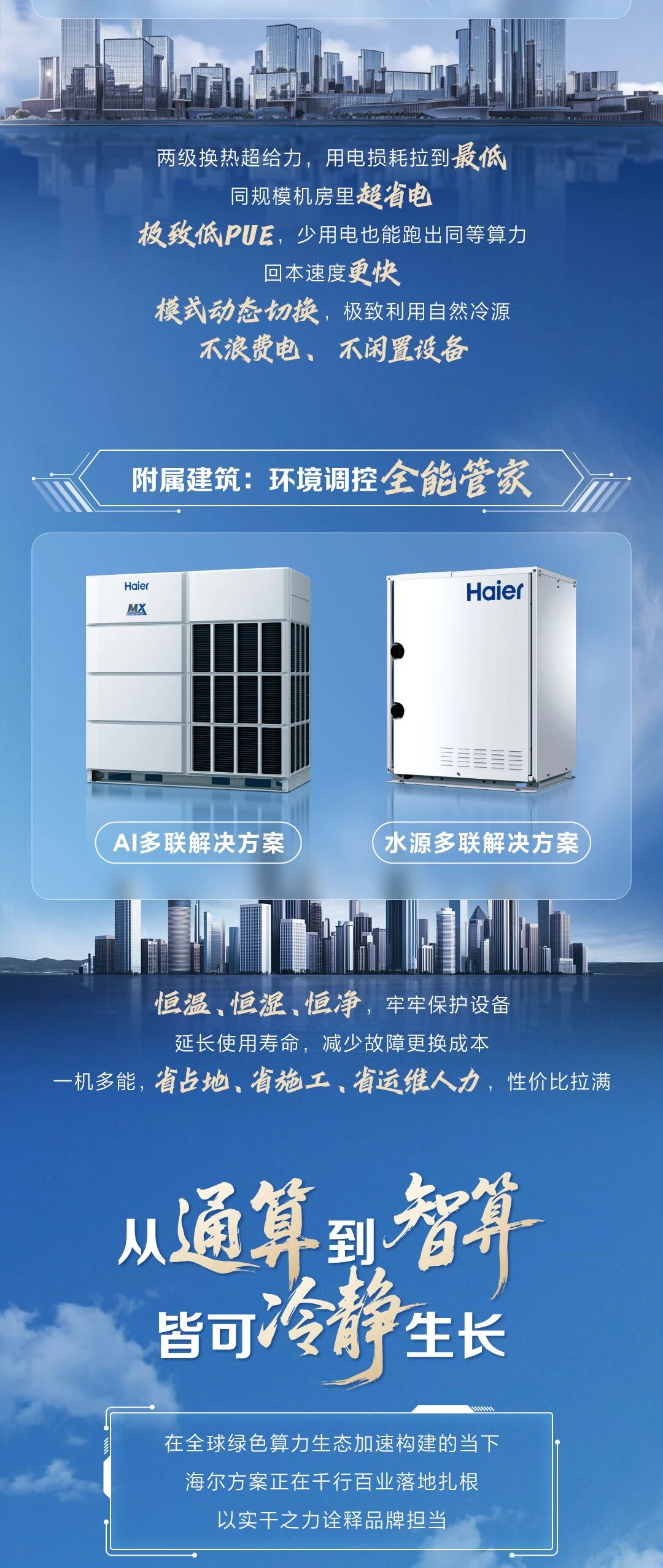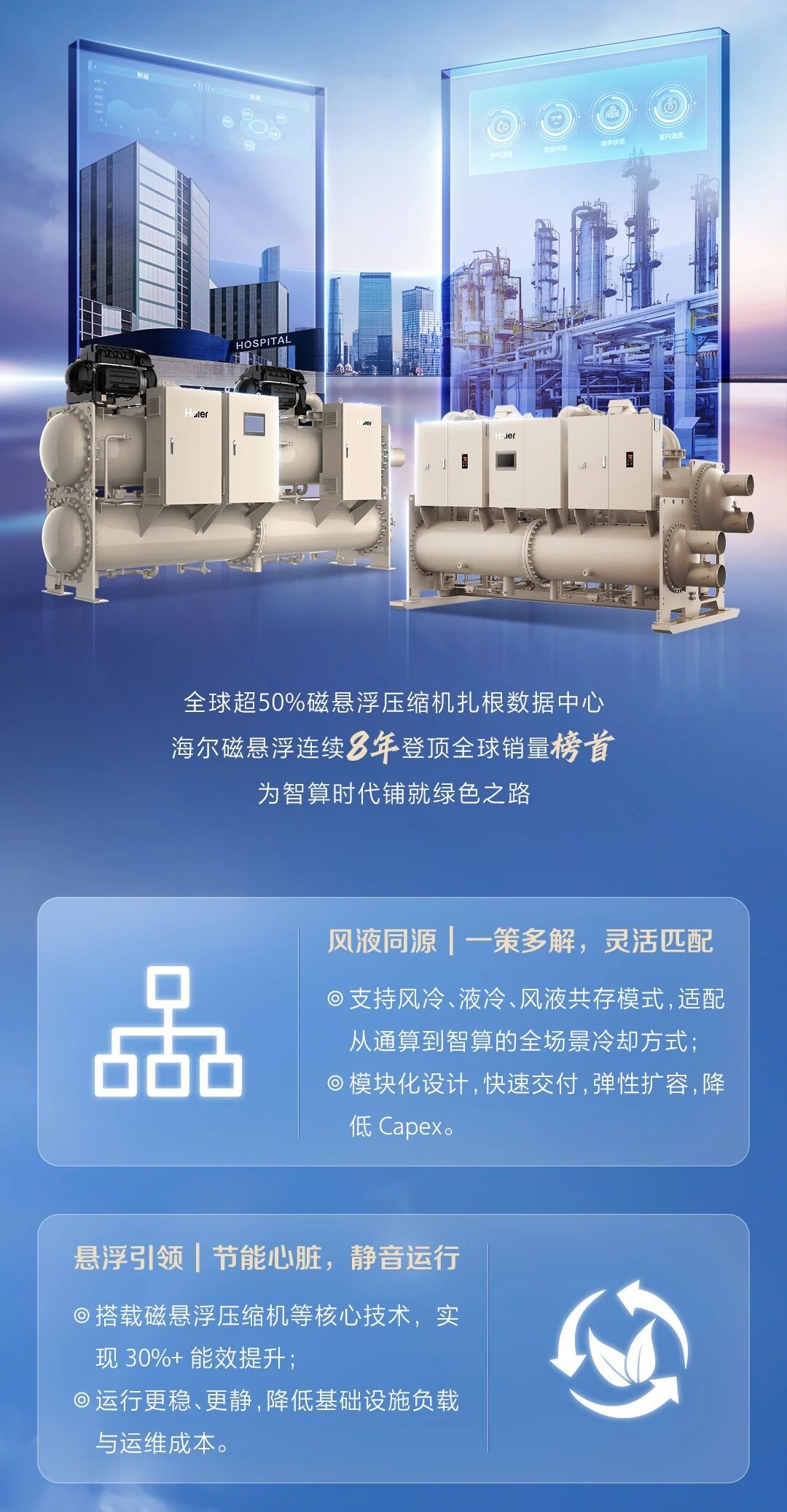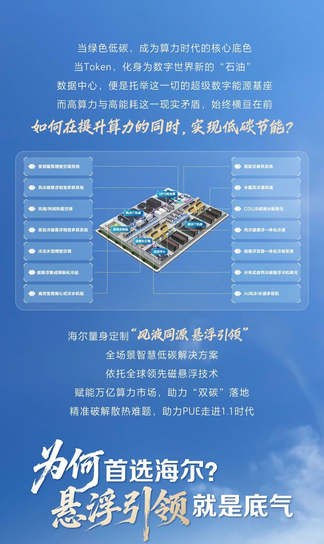 海尔量身定制“风液同源悬浮引领”全场景智慧低碳解决方案,依托全球领先磁悬浮技术,赋能万亿算力市场,助力“双碳”落地,精准破解散热难题,助力PUE走进1.1时代。